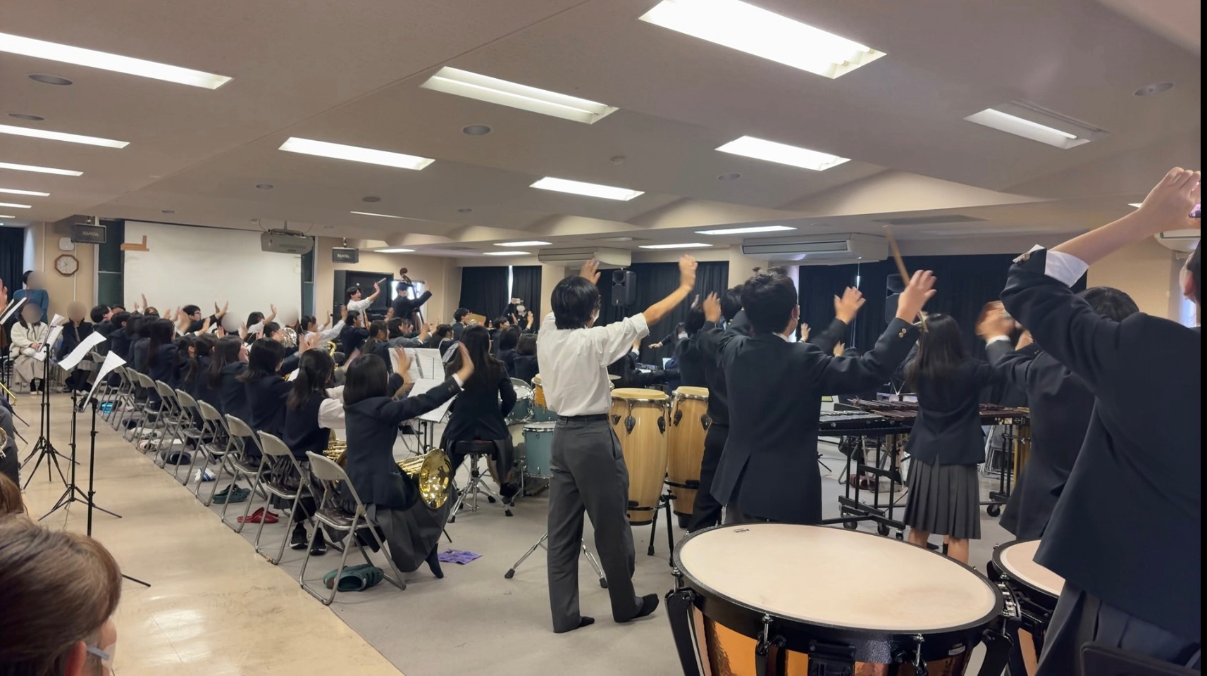 参加してくださった中学生の皆様にはパート練習後、部員と一緒に「宝島」の合奏を体験していただきました。